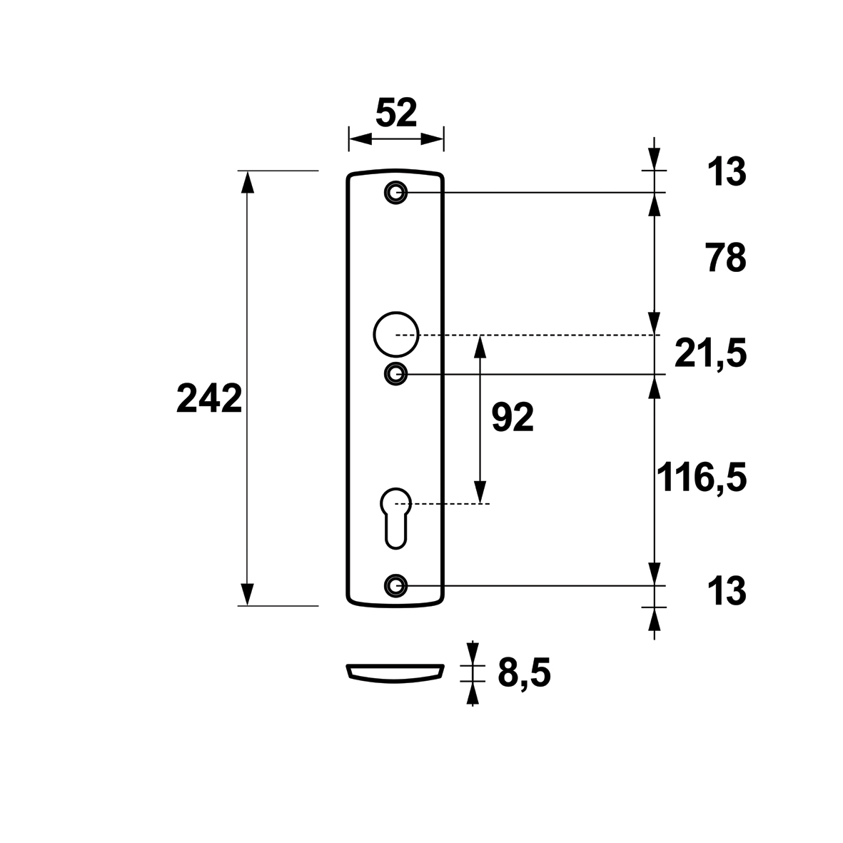 Typ Maß Mittelpunkt–Mittelpunkt Drückerloch - Profilzylinderloch (PZ)