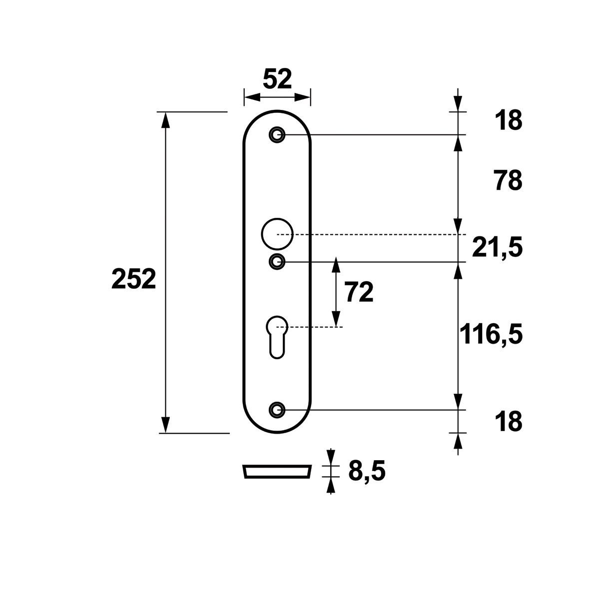 Typ Maß Mittelpunkt–Mittelpunkt Drückerloch - Profilzylinderloch (PZ)