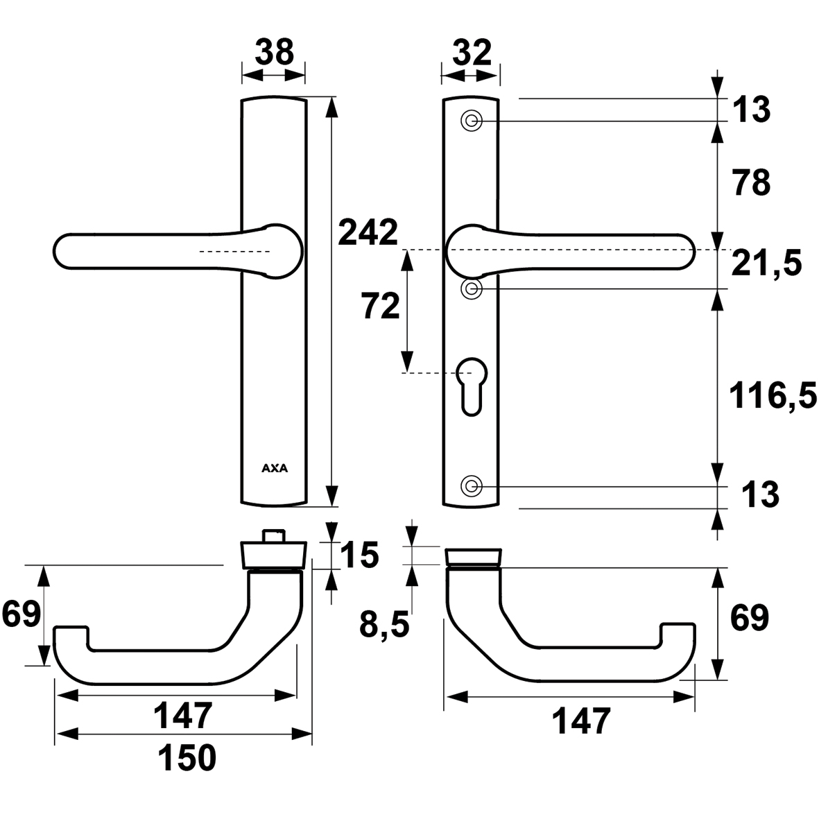 • standaard toepasbaar op deuren van 38 tot 67 mm dik
